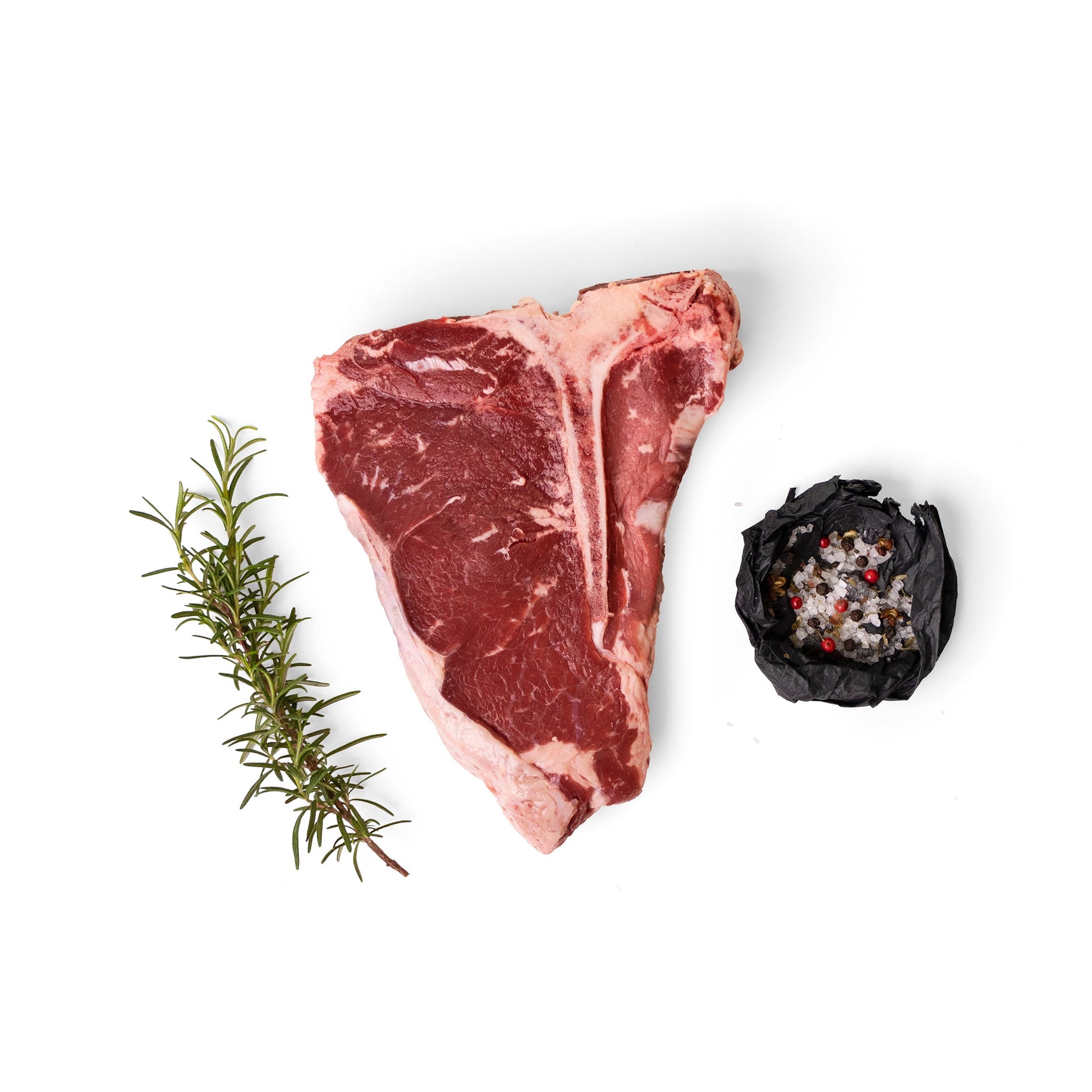 Fiorentina T-Bone in porzione da 600 g. In italiano non c'è un termine per definire quelle che gli Americani chiamano T-Bone e Porterhouse Steak. Per noi sono entrambe "bistecca alla fiorentina", cioè quel taglio di carne di bovino adulto che viene dal muscolo posteriore, ovvero la lombata.