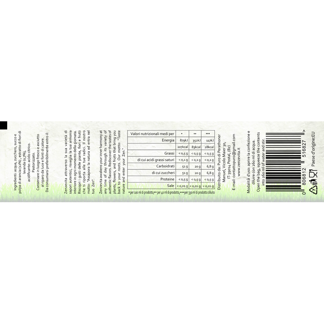 Ingredienti: Acqua, zucchero, succo e polpa di arancia (8,5%), estratto di fiori di lavanda (0,7%), acido citrico. Pastorizzato.