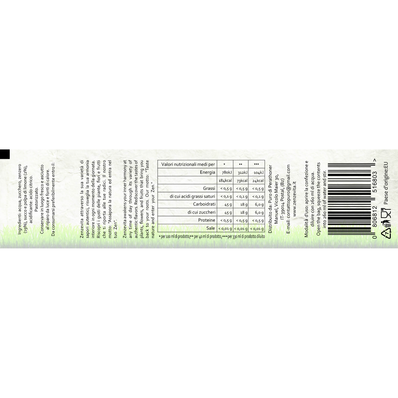 Ingredienti: Acqua, zucchero, estratto di zenzero (23%), succo e polpa di limone (3%), acido citrico. Pastorizzato.